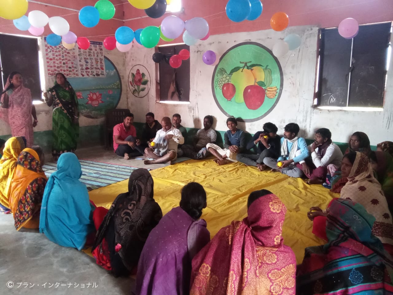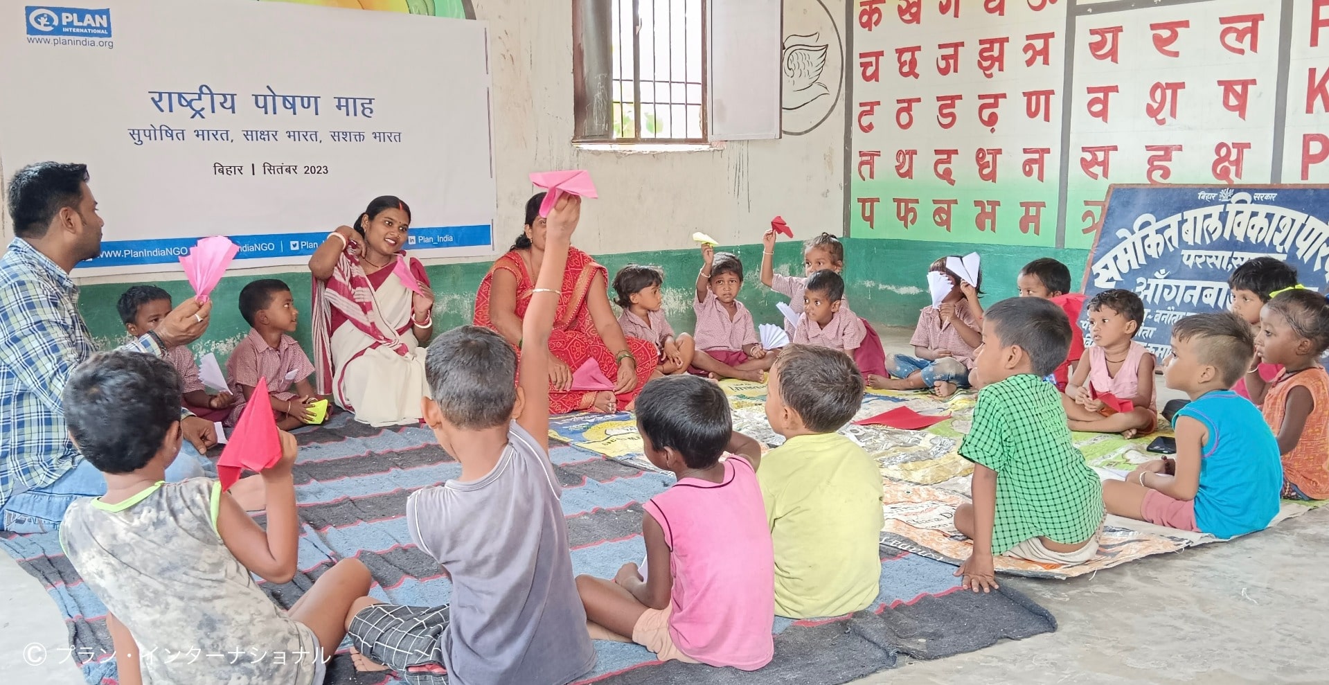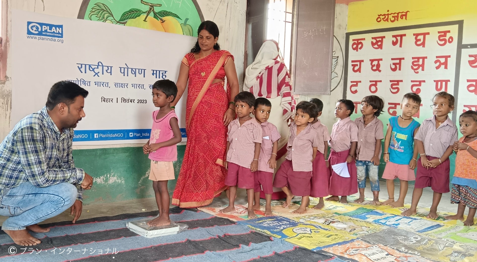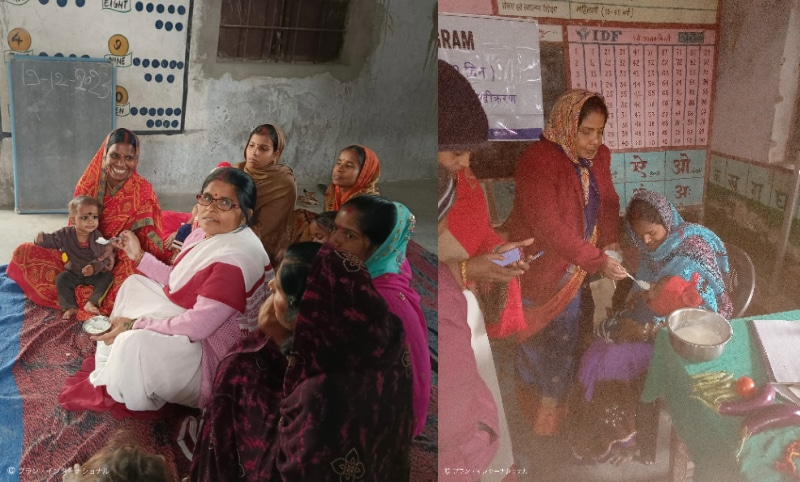 子どもとその母親139人を招待し、「アンナプラシャン」をともに祝った後、栄養についての講習を実施。授乳の継続、離乳食、母親の衛生習慣について指導するとともに、栄養価の高い地産食材も紹介した。
