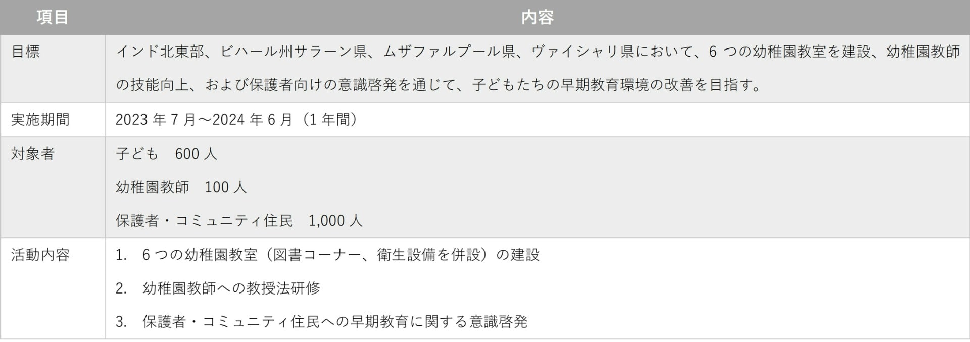 2022年にインド・ビハール州に6つの幼稚園教室を建設。そして新たに積み立てた寄付金額1,000万円にて、昨年2023年より、さらに6つの幼稚園教室(図書コーナー、トイレ・手洗い施設併設)の建設、幼稚園教師の技能向上、及び保護者向けの意識啓発を通して、子どもたちの早期教育環境の改善を目指しています。