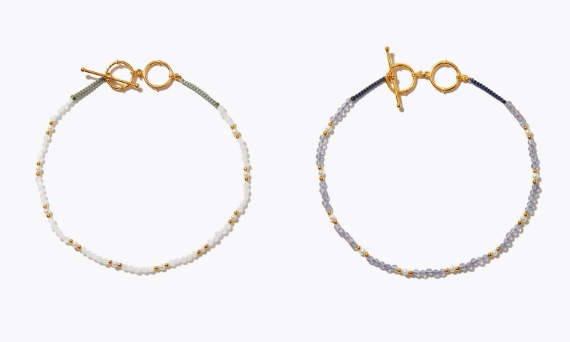 “I am” Donation rainbow moonstone baby pearl anklet 6,600yen (with tax) / “I am” Donation iolite baby pearl anklet 6,600yen (with tax)