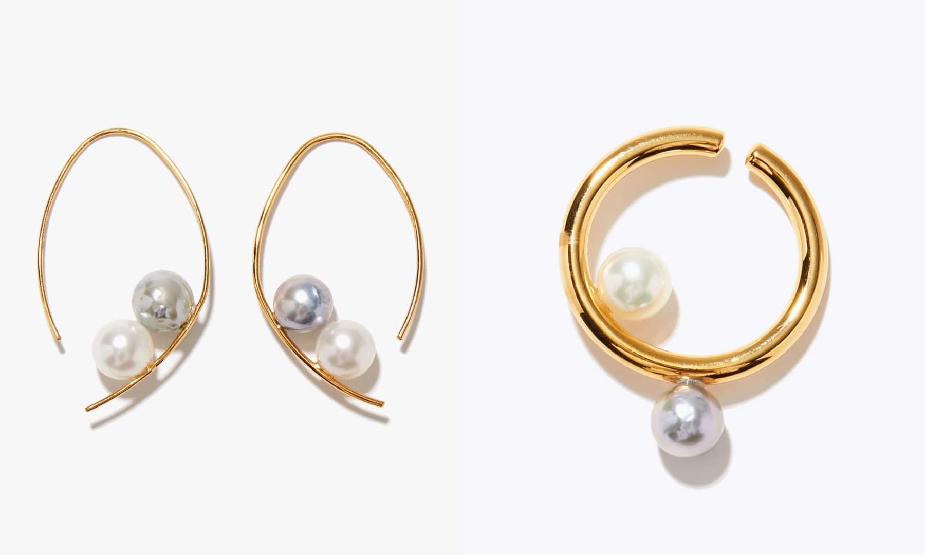 左は、美しい曲線に2色のアコヤパールが愛らしく寄り添うようなペアのピアス。右は、絶妙なバランスでパールを配した、モダニティ溢れるイヤーカフ。