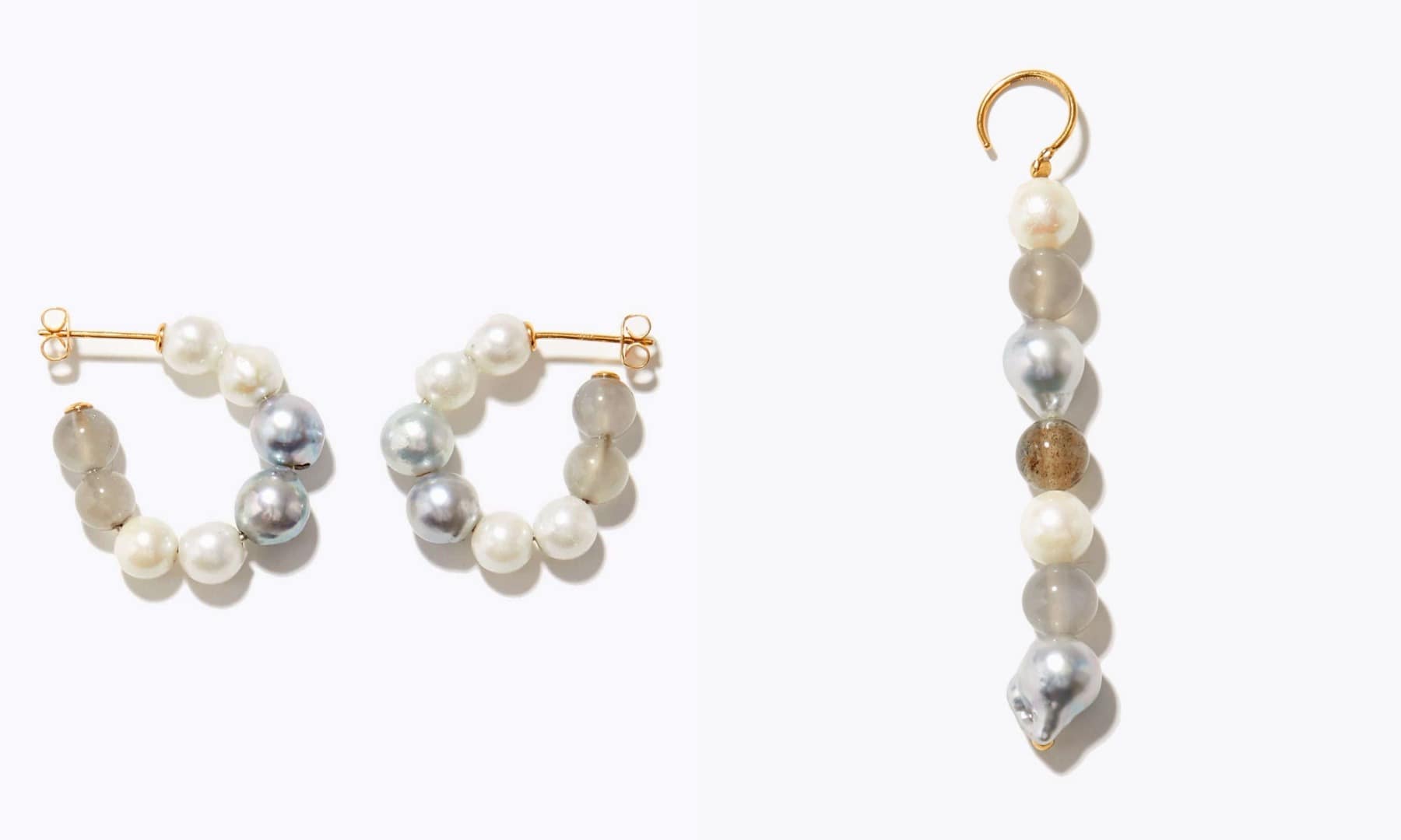 左は、個性豊かなブルーグレーとホワイトのバロックパールに、グレームーンストーンを組み合わせたフープピアス。右は、さらにラブラドライトも加えた配色のシングルピアス。こちらはシングル販売なので左右ペアで揃えたり、シンプルなパールのスタッドピアスと合わせたりと、アシンメトリーのスタイリングもおすすめです。