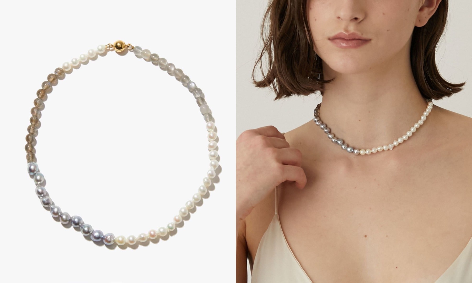 2色のアコヤパールとグレーを基調とした天然石を、バランスよく配したネックレスとチョーカーもご用意しました。クラスプ(留め具)はお好きな位置でアクセントとしても楽しんでいただけるよう、ゴールドボールのデザインに仕上げました。