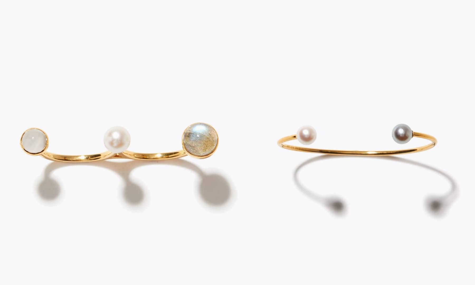左は、アコヤパールとグレームーンストーン、ラブラドライトのニュートラルなカラーの天然石が指の間に浮き立つような、ダブルフィンガーリング。右は、2色のアコヤパールのコントラストが美しいオープンバングル。