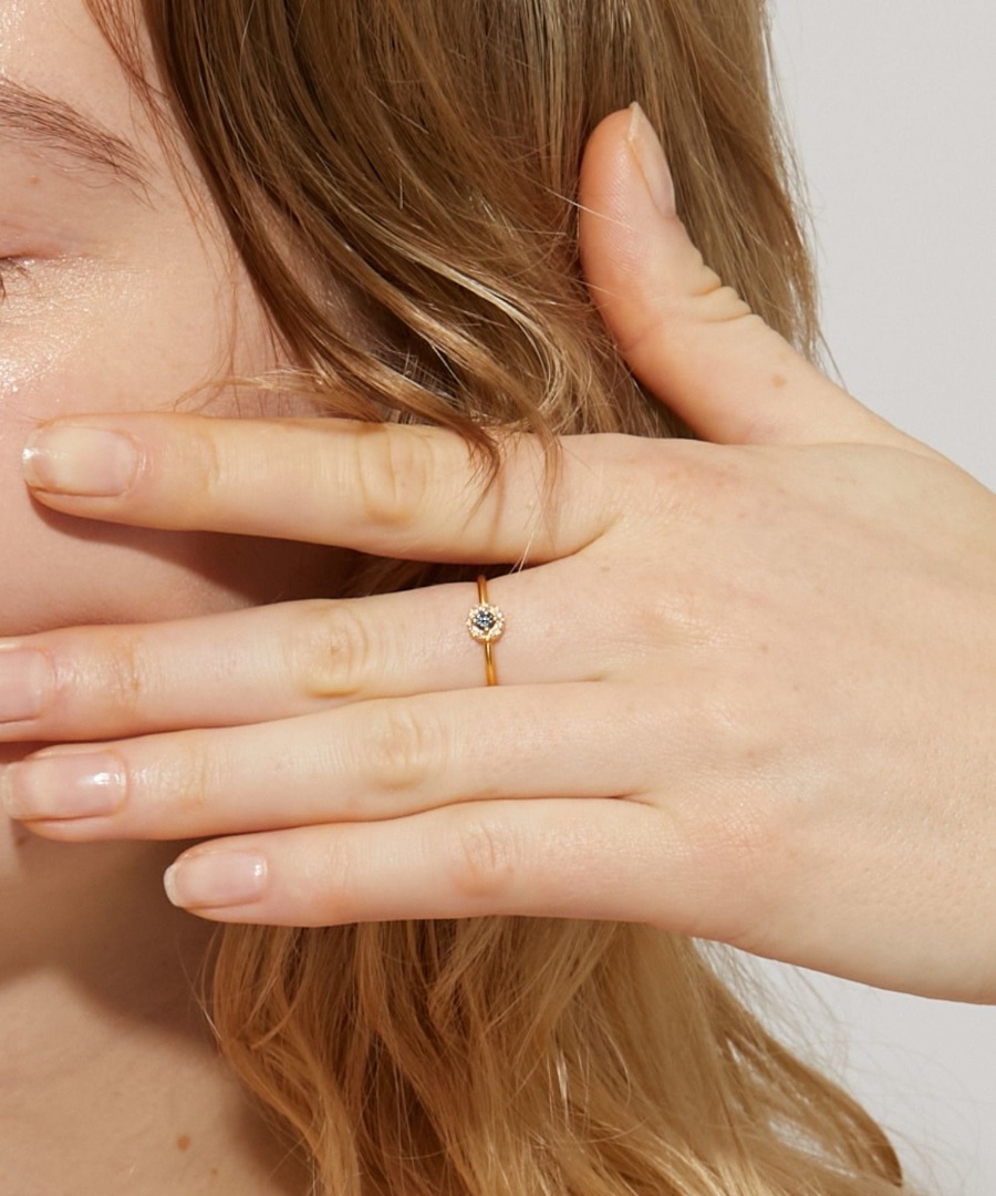 ホワイトのパヴェダイヤモンドで周りを取り巻き、華奢ながら、華やかな印象のデザインに落とし込みました。