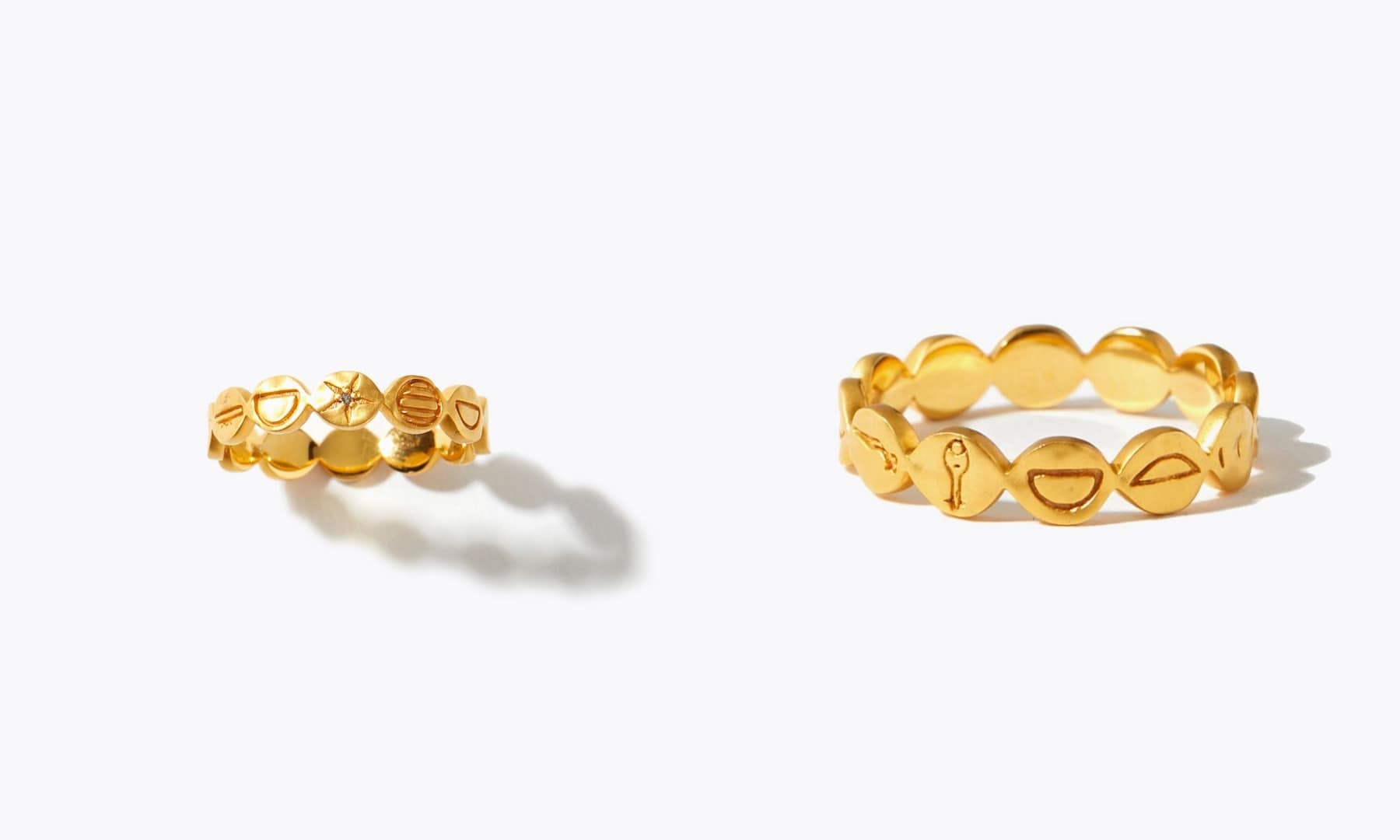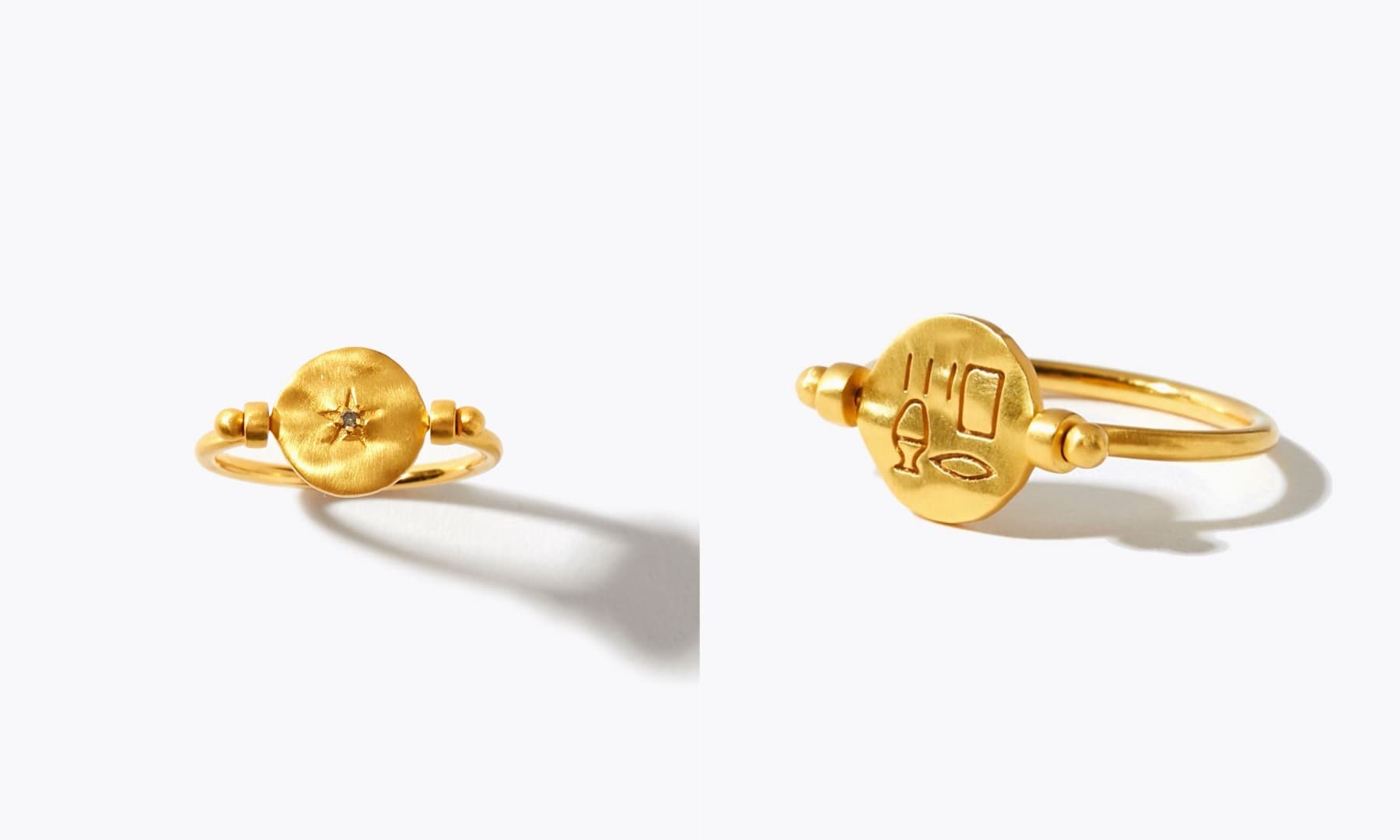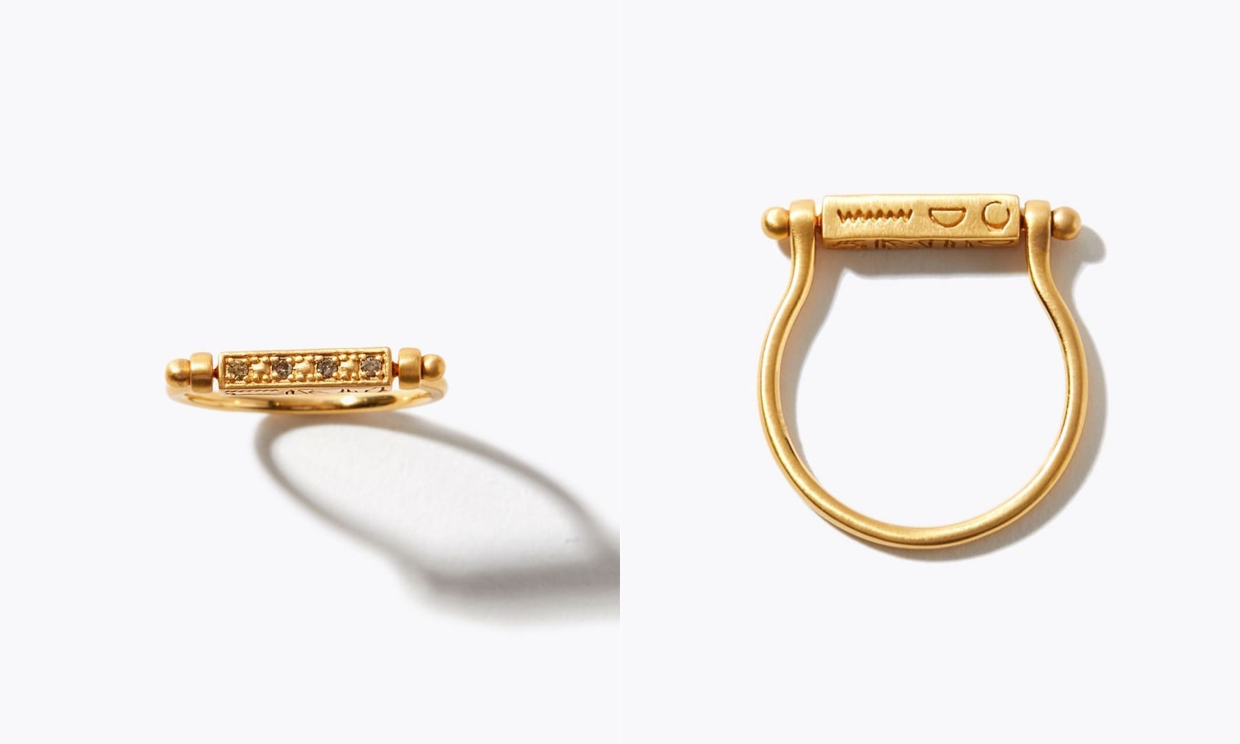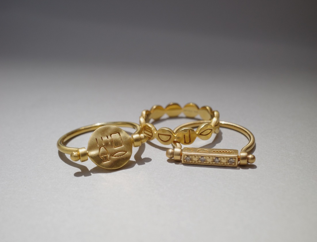 華奢な円盤をエタニティリングのように一周連ね、そのひとつひとつにヒエログリフを丁寧に刻みました。小さなダイヤモンドも2石、星のモチーフの中に忍ばせ、煌めきを添えています。