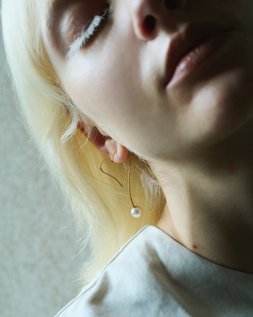 右:やわらかなラインで描かれた、ユニークなハートモチーフのピアス。職人が一つひとつ丁寧に形作っています。取り外し可能なアコヤパールにはシリコン製の留め具を内蔵し、他のピアスのキャッチとして使うなど、自由なアレンジが楽しめます。