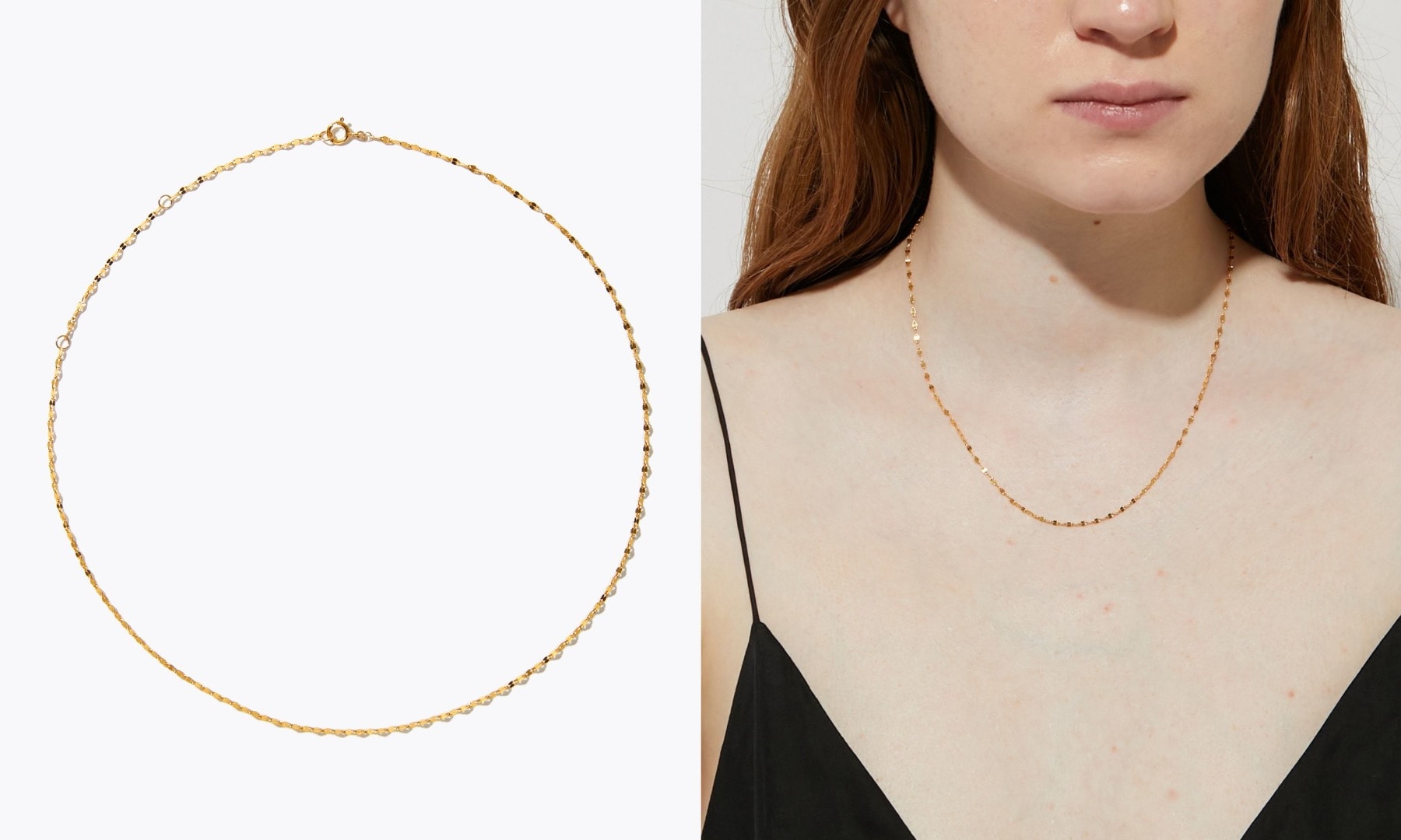 まるで花びらが重なり合うような繊細さを放つペタルチェーンのネックレス。平たく面のあるパーツが光をなめらかに反射し、やさしい艶感を生み出します。