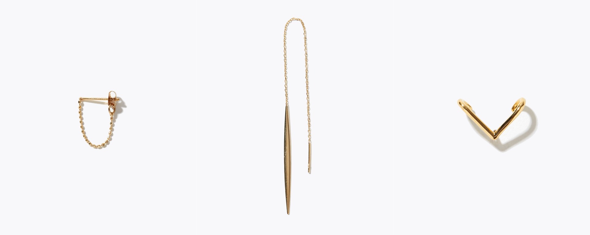 真ん中:K10チェーンが繊細に煌めき、槍のように細長く尖ったモチーフを垂らしたピアス。シリコンキャッチでチェーンの長さを自由に調整でき、装いに合わせたさまざまな表情を楽しめます。片耳にシンプルなピアスを合わせて、アシンメトリーに仕上げるのもおすすめです。