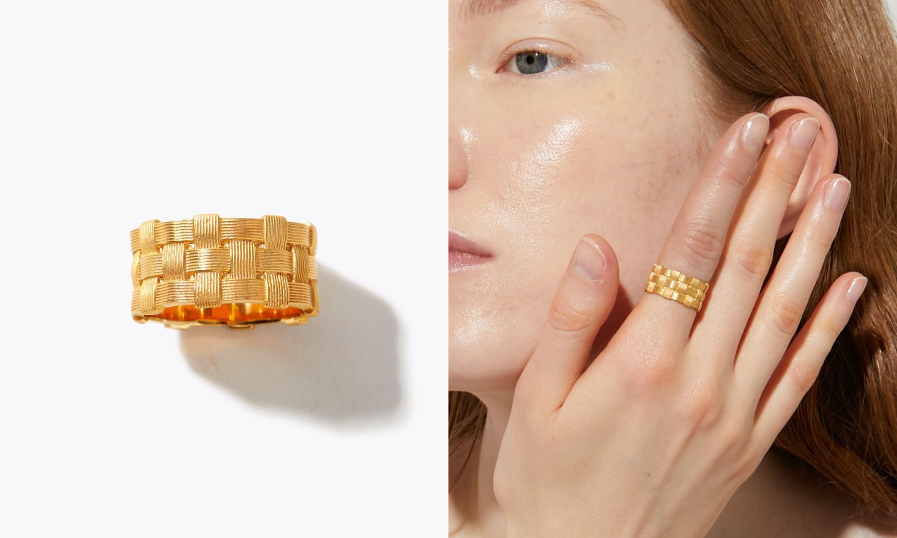 古代の文明や財宝から着想を得て、祈りや絆を象徴する編み込み模様を繊細に再現したワイドリング。つながりを思わせる編み込みのモチーフは、さりげなくも力強い存在感を放ちます。