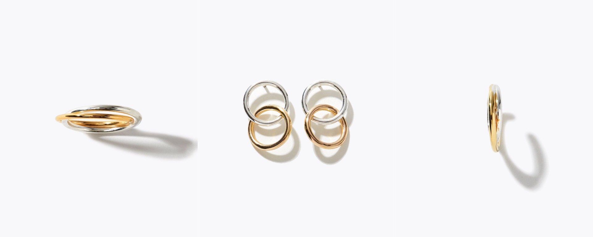 異なるふたつの輝きが寄り添う、シンプルなサークルを連ねたリング、ピアス、イヤーカフ。 シルバーとゴールドのラインは、太さを変え、ミニマムなデザインの中にも奥行きとリズムが感じられるようアレンジしました。