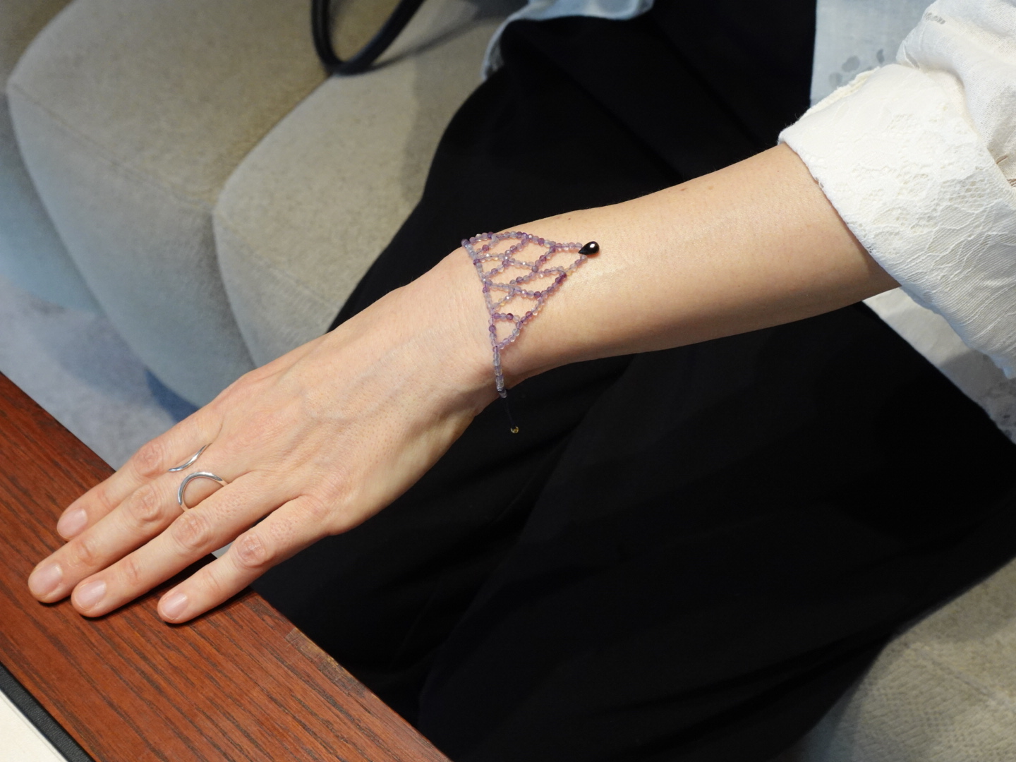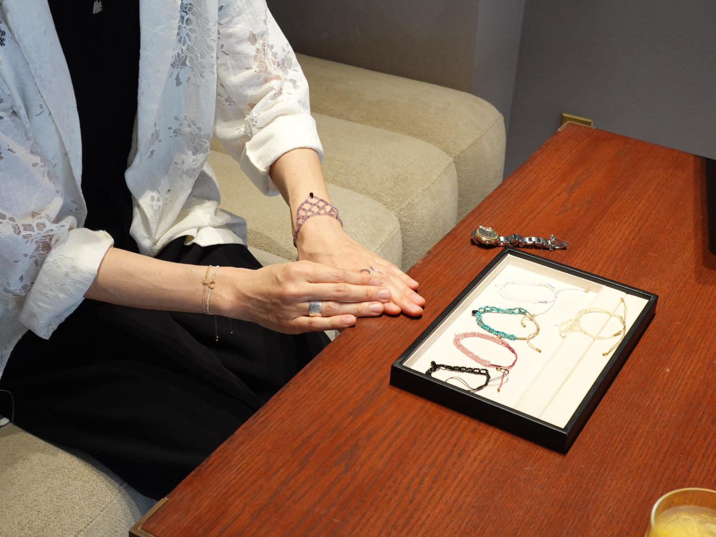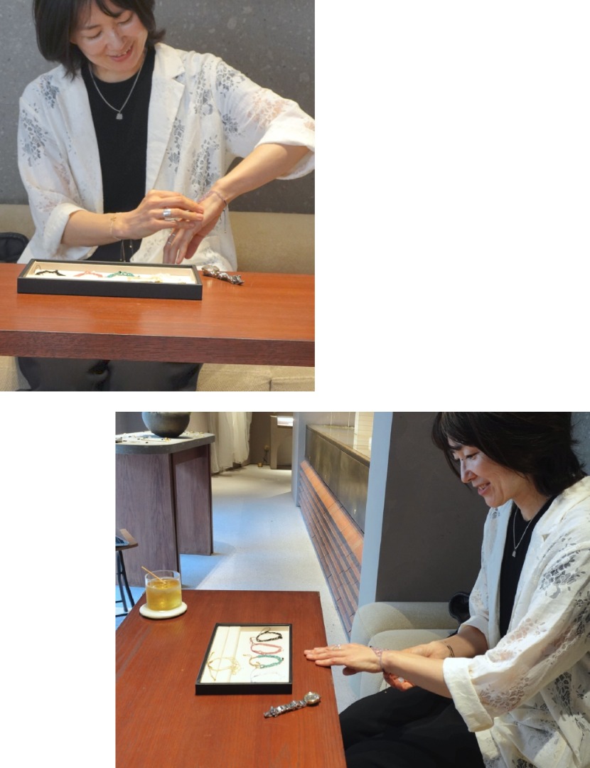 「日常でつけやすいデザインなので、いつも自分を守ってくれるお守りのようにつけていたいです。さざなみデザインは特におしゃれをしたい時にもつけたいですね。美しい天然石に魅了されて癒されます。」