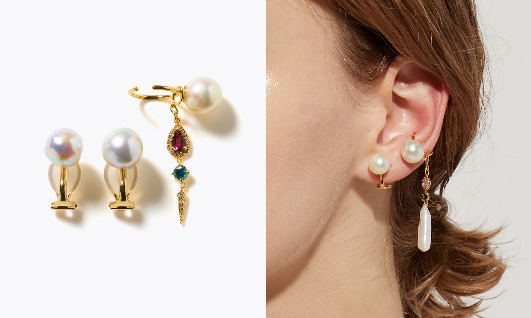 左右ペアでご用意したクリップタイプのイヤリングだけでシンプルに着けたり、イヤーカフは別のイヤリングとのレイヤードスタイルを楽しんだりと、様々なアレンジをしていただけます。