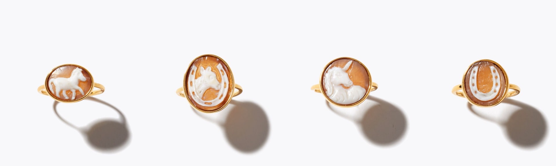 ユニコーンや、幸せの象徴である馬蹄のモチーフを添えたデザイン、ピンキーリングなど、4種類のリングをご用意しました。