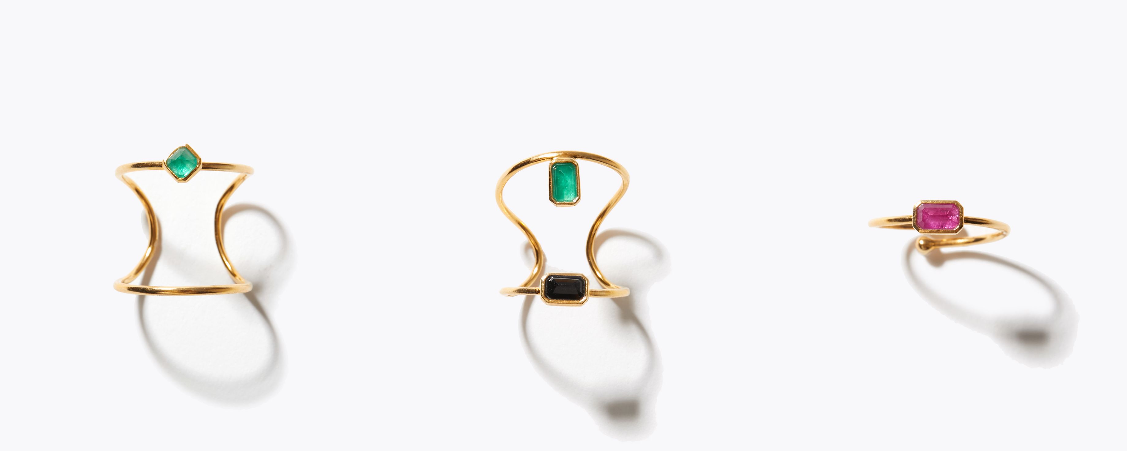 エメラルドやルビー、ロンドンブルートパーズ、オニキス。オリエンタルなカラーストーンをあしらいました。ファランジリング(関節に着けるリング)やピンキーリングとしてのアレンジもお楽しみいただけます。