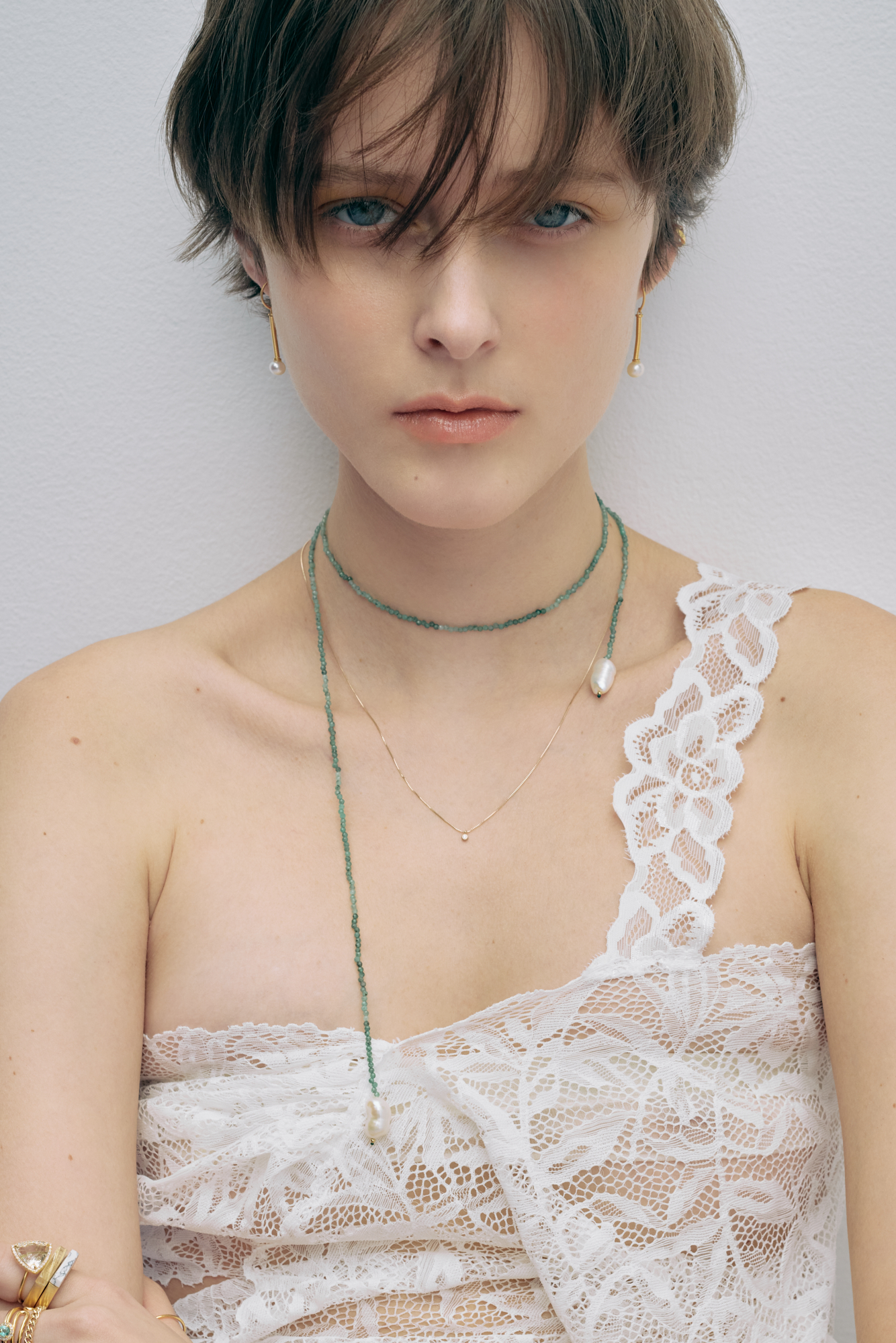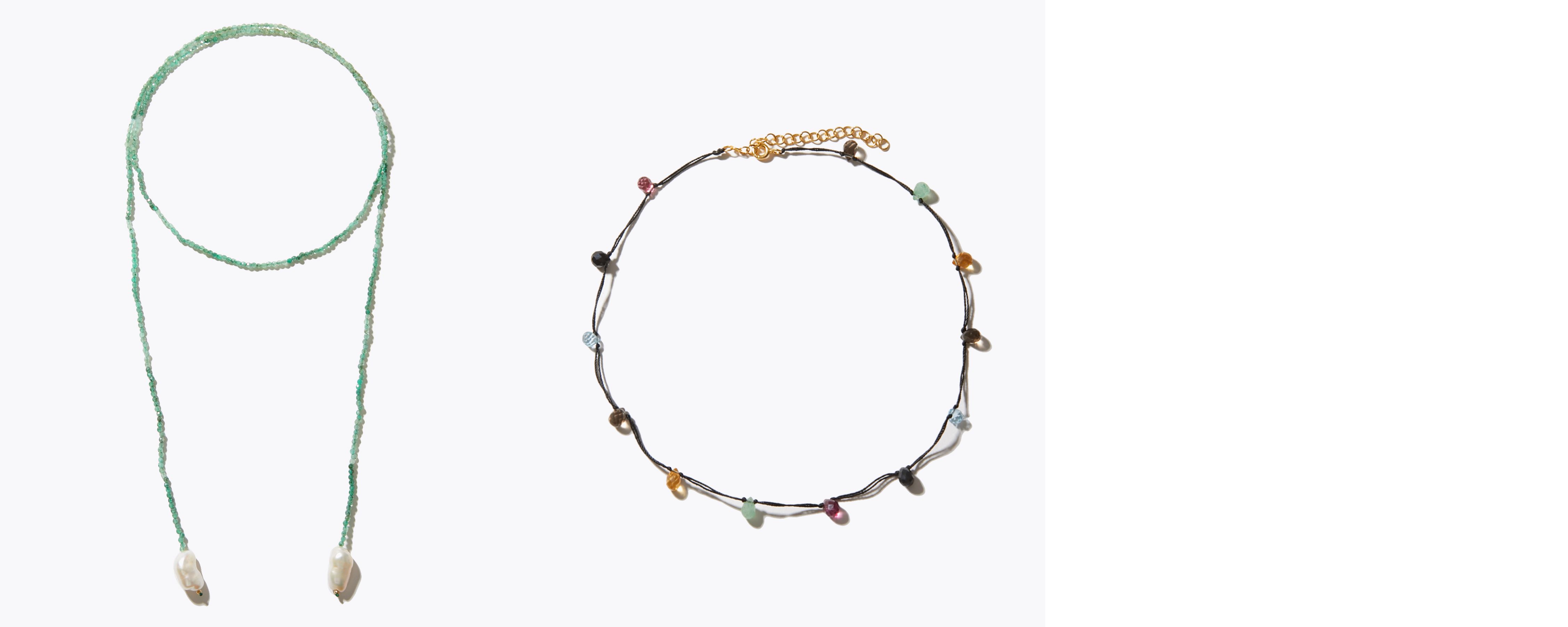 左のフレッシュな印象のエメラルドのネックレスは、留め具がない1本のタイプ。約80cmの長さがあるので、モデル着用のようにぐるりと巻きつけたり、ラリアットのように結んで着けたりと、お好みでさまざまなスタイルでお楽しみいただけます。愛らしいバロックパールがアクセントに。