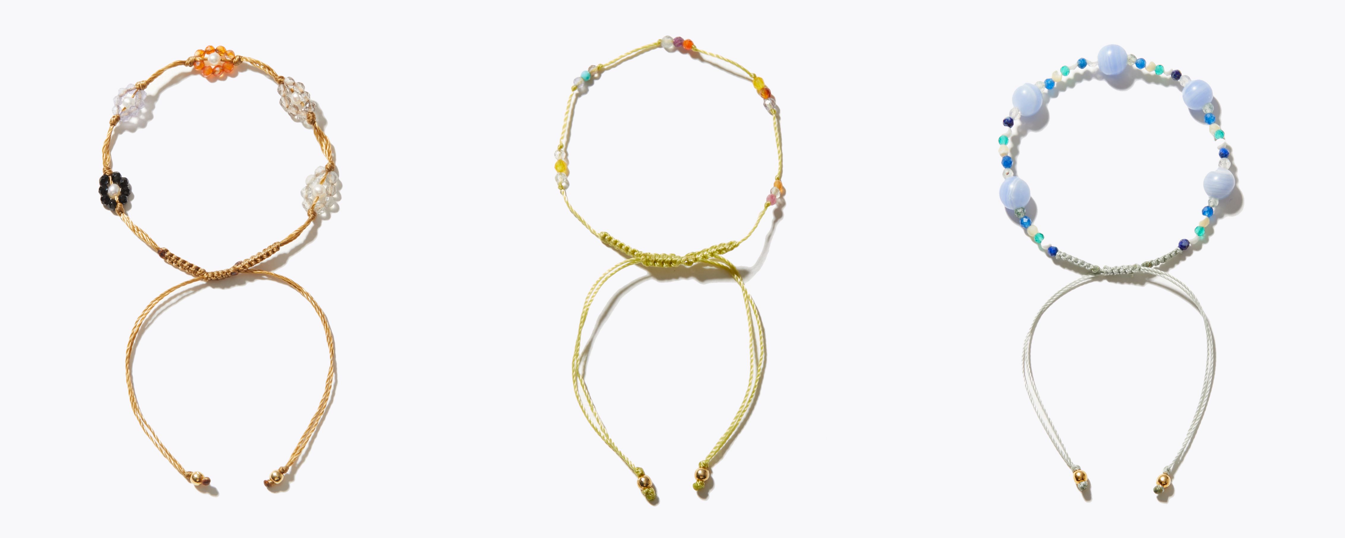 夏らしいカラフルな天然石をあしらったブレスレットも3種類ご用意しました。色合わせしやすい天然石なので、腕を見せる機会が増えるこれからの季節に、重ねてつけていただくのもおすすめです。