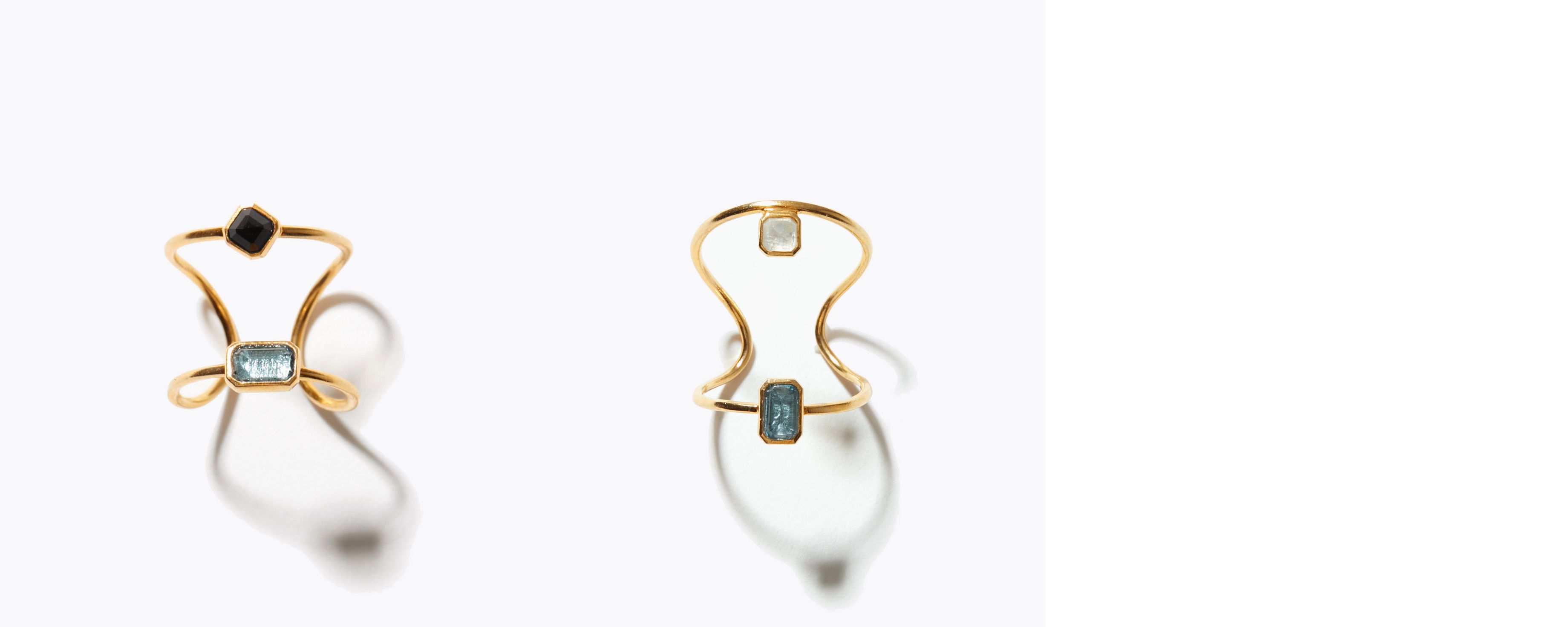 “ancient”の新作は、初夏に映えるカラーストーンをフラットにカットしたモダンなリングが登場します。艶のあるシャープな天然石と、曲線を描くゴールドのコントラストが美しいデザイン。次にご紹介する、ネイルリングとのレイヤードもおすすめです。
