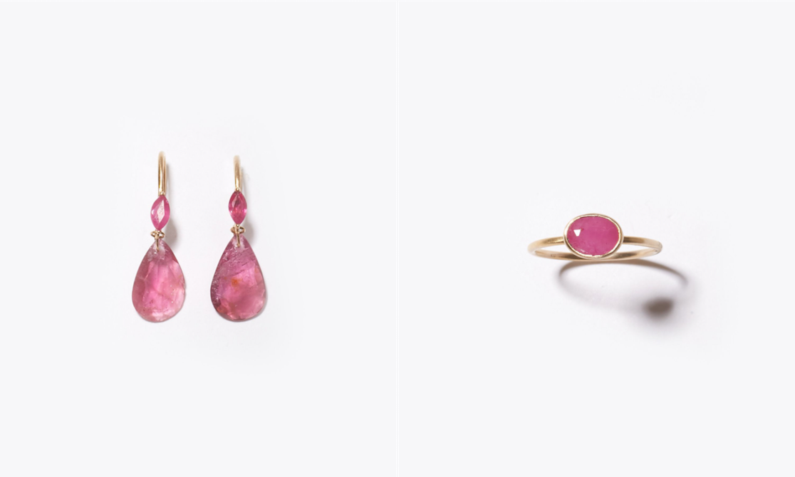 "eutopia" K10YG pink tourmaline and ruby swing pierced earring 30,240yen (with tax) / "eutopia" K10YG sliced ruby ring 36,720yen (with tax)