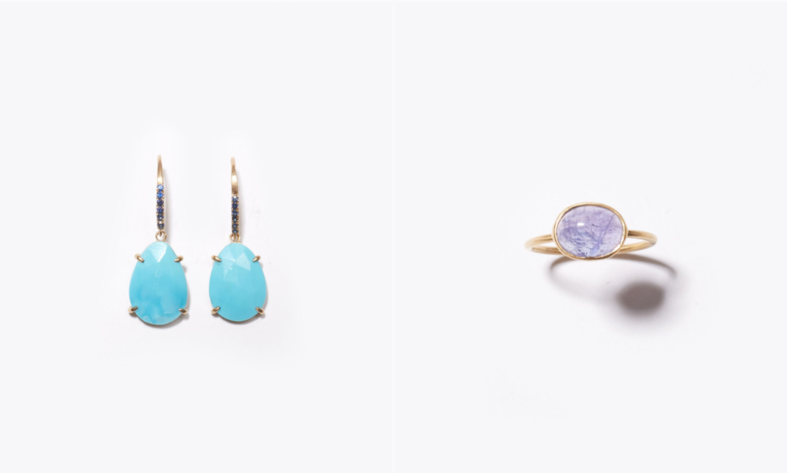 "eutopia" K10YG turquoise and blue sapphire swing pierced earring 39,960yen (with tax) / "eutopia" K10YG cabochon tanzanite ring 30,240yen (with tax)