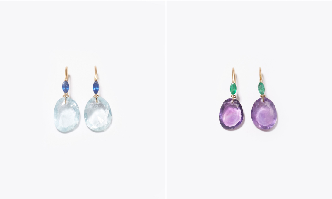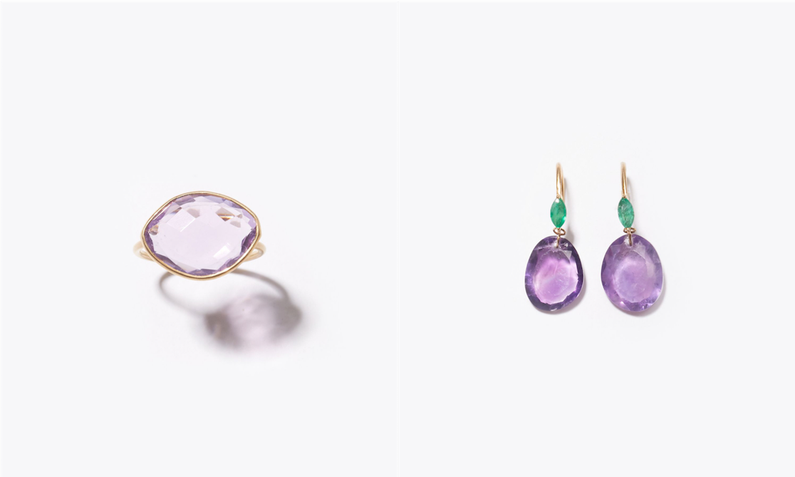 "eutopia" K10YG sliced amethyst pebble ring 31,320yen (with tax) / "eutopia" K10YG amethyst and emerald swing pierced earring 30,240yen (with tax)