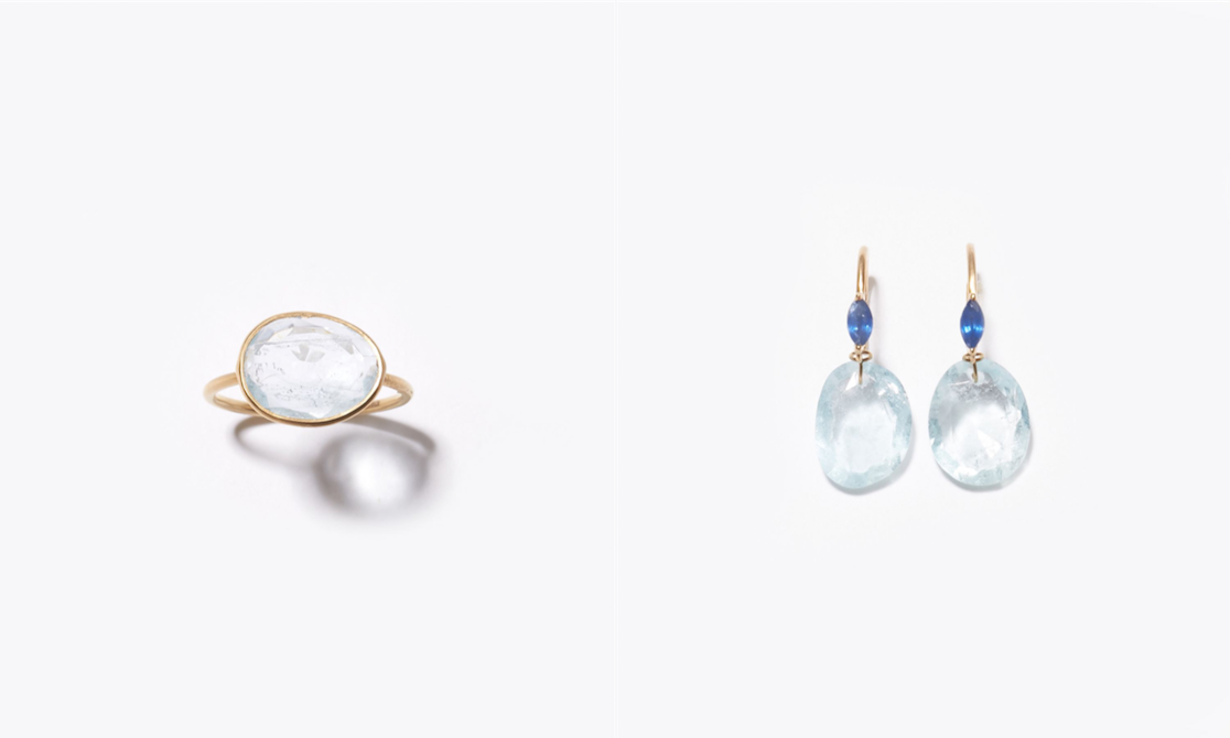 "eutopia" K10YG sliced aquamarine ring 32,400yen (with tax) / "eutopia" K10YG aquamarine and blue sapphire swing pieced earring 35,640yen (with tax)