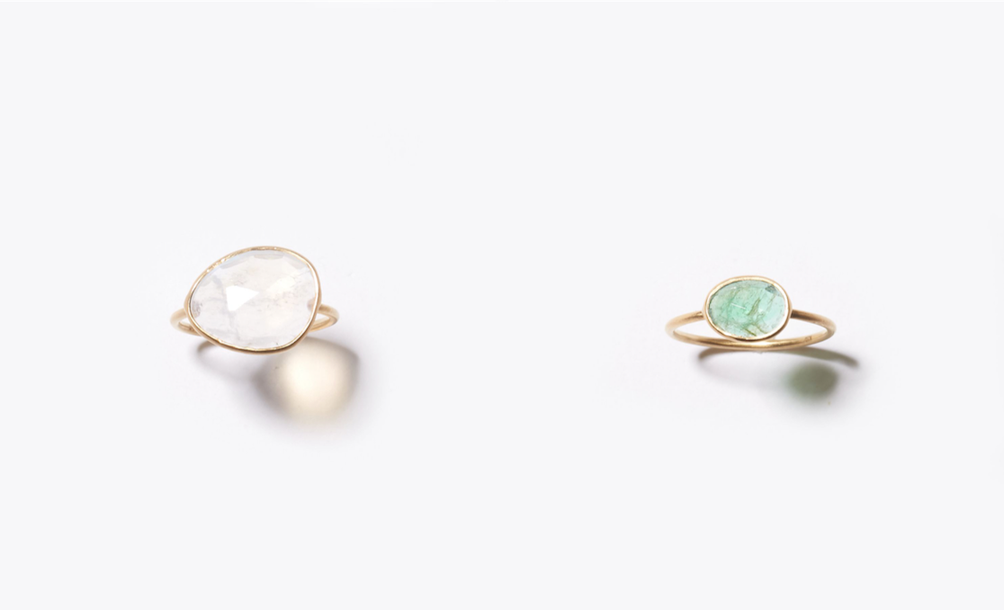 "eutopia" K10YG sliced rainbow moonstone pebble ring 34,560yen (with tax) / "eutopia" K10YG sliced emerald ring 32,400yen (with tax)