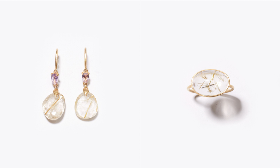 "eutopia" K10YG gold rutilated quartz and amethyst swing pierced earring 37,800yen (with tax) / "eutopia" K10YG cabochon gold rutilated quartz ring 31,320yen (with tax)