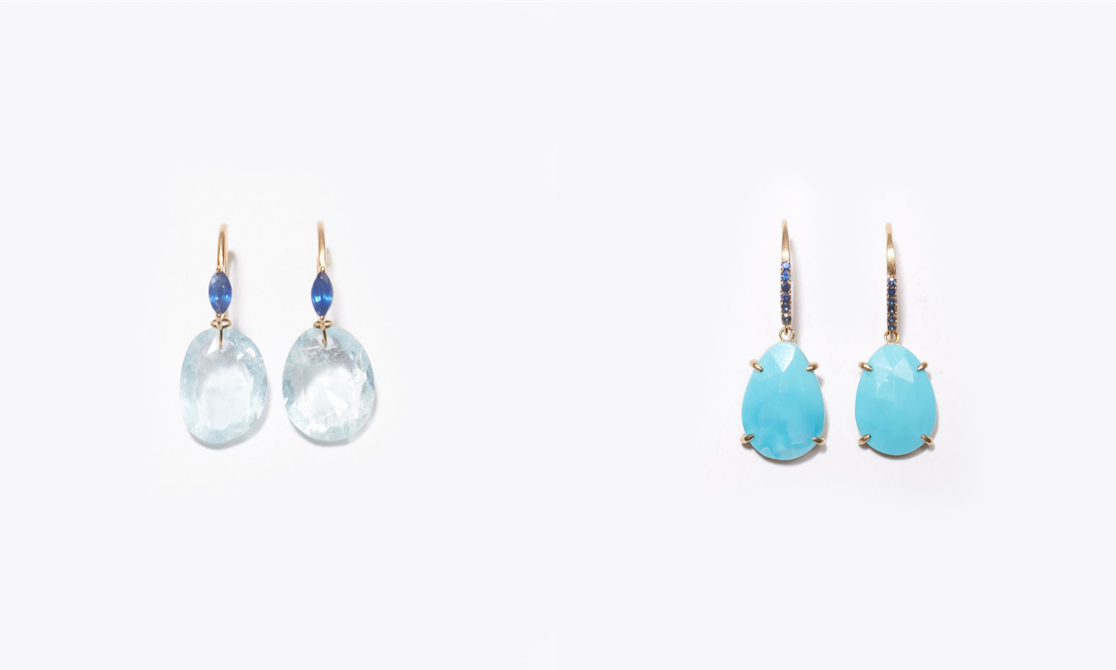 "eutopia" K10YG aquamarine and blue sapphire swing pieced earring 35,640yen (with tax) / "eutopia" K10YG turquoise and blue sapphire swing pierced earring 39,960yen (with tax)
