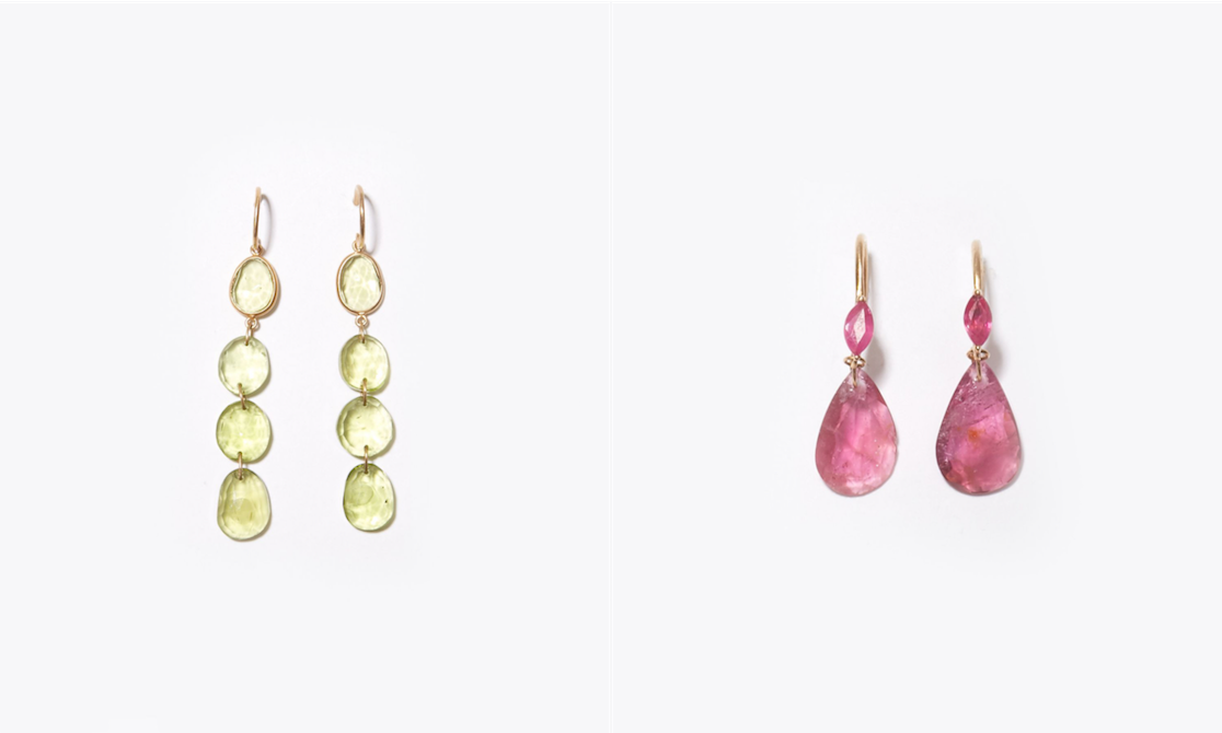 "eutopia" K10YG peridot drops pierced earring 39,960yen (with tax) / "eutopia" K10YG pink tourmaline and ruby swing pierced earring 30,240yen (with tax)