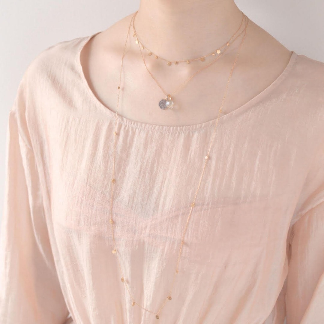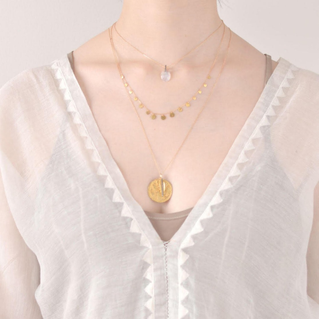 (上から)"krishna" K10YG coin choker 36,720yen (with tax) / "elafonisi" gold rutilated quartz pave diamonds charm 15,120yen (with tax) / "selene" grand-disque pave diamonds charm 28,080yen (with tax) / "basic" K10YG chain short necklace 11,880yen (with tax) / "krishna" K10 coin long necklace 89,640yen (with tax)