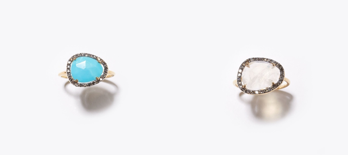 "elafonisi" turquoise pave diamonds ring 25,920yen (with tax) / "elafonisi" rainbow moonstone pave diamonds ring 27,000yen (with tax)