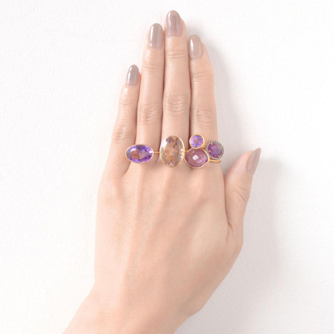 (人差し指上から)"eden" K10YG round amethyst bezel ring 29,160yen (with tax) / "elafonisi" amethyst pave diamonds ring 25,920yen (with tax) / "eutopia" K10YG sliced amethyst pebble ring 31,320yen (with tax)(中指)"eden" K10YG big oval ametrine ring 29,160yen (with tax) / "eden" K10YG oval dark amethyst ring 29,160yen (with tax)