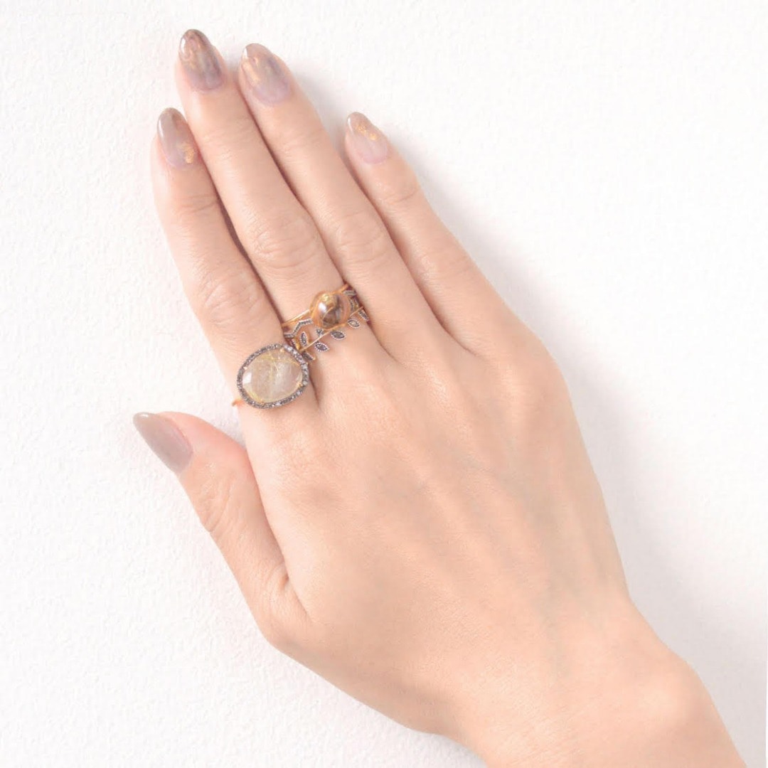 (人差し指)"elafonisi" gold rutilated quartz pave diamonds ring 28,080yen (with tax) /(中指)"eden" K10YG citrine peach swing ring 30,240yen (with tax) / "citronnier" leaves pave diamonds ring 25,920yen (with tax)