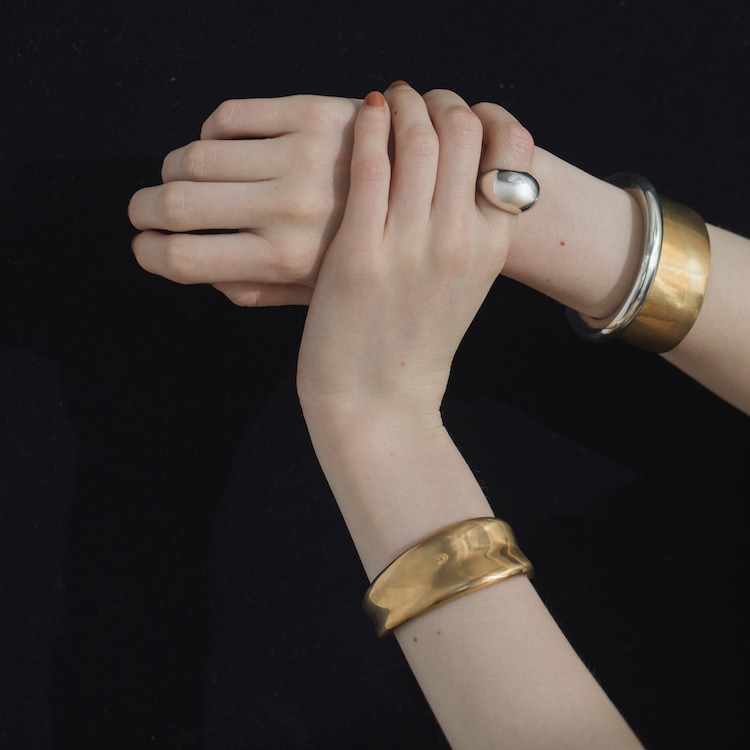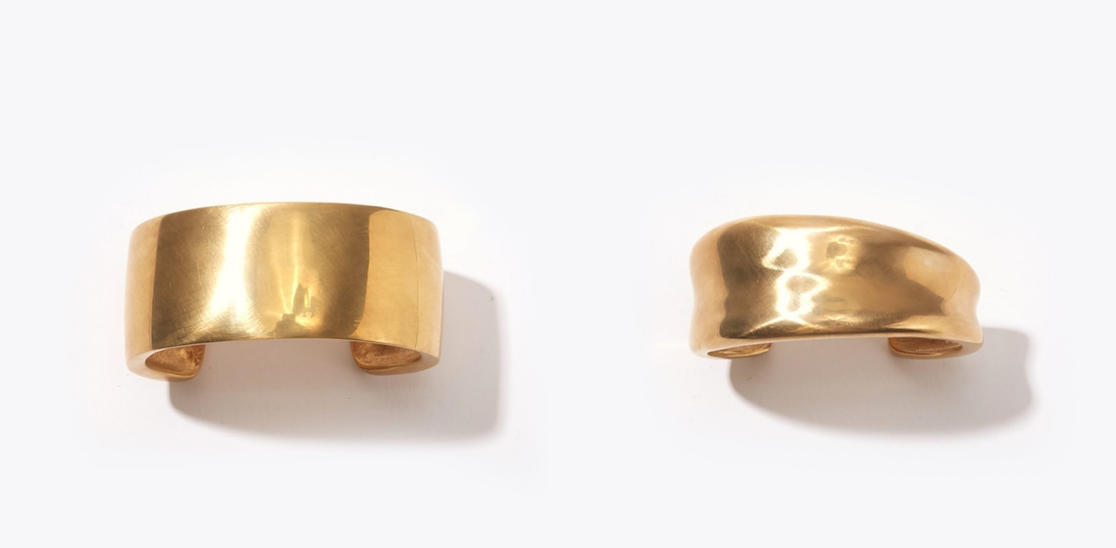 こちらは真鍮+K18 plating素材の新作。存在感があるので、ひとつ取り入れるだけでスタイリングが引き締まります。左のオーガニック wideバングルは、モダンながらぽってりとしたフォルム。右のビーンwideバングルは、有機体のような丸みが魅力です。