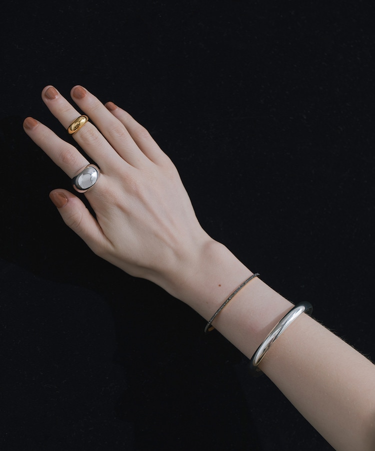 これまでも多くのリクエストをいただいていた、ARTIDA OUD初のシルバー。SILVER 925+クロメートメッキ素材です。同時に発売する大振りのゴールドバングルや、華奢なゴールドジュエリーとミックスするレイヤードスタイルをご提案していきます。