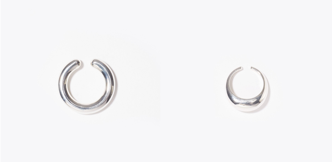 こちらはシルバー素材のイヤーカフ2型。オーガニック イヤーカフと、オーガニック チャンキー イヤーカフです。ゴールドカラーで人気のモデルをシルバーにしました。潔くシンプルに着けたいですね。