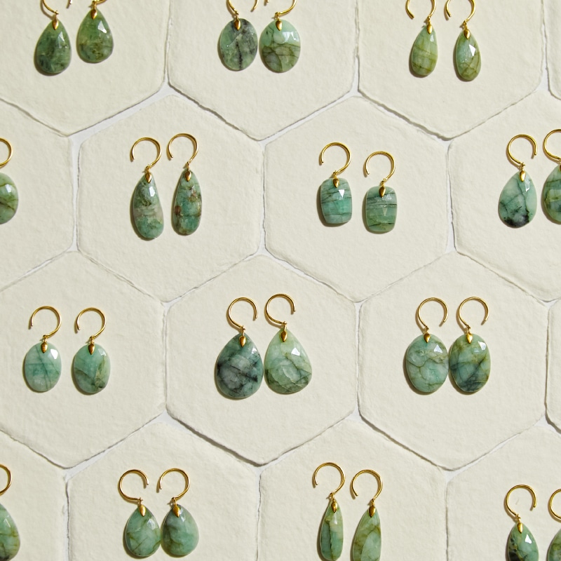 同じくK10YG+K18YG platingでかたどり、木の葉モチーフを添えたフック型ピアスのエメラルドバージョンです。オーガニックなシェイプとミルキーカラーが、涼しげな耳元を演出します。