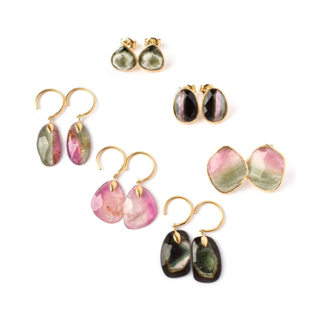この記事のトップ画像は、バイカラートルマリンのピアス。まるでスイカのような瑞々しさが美しい、ウォーターメロントルマリンも含まれます。K10YG+K18YG platingでシンプルに覆輪留めにしたスタッドピアスと、木の葉モチーフのバチカンを添えたフック型のピアスです。表面はダルフィニッシュで仕上げています。