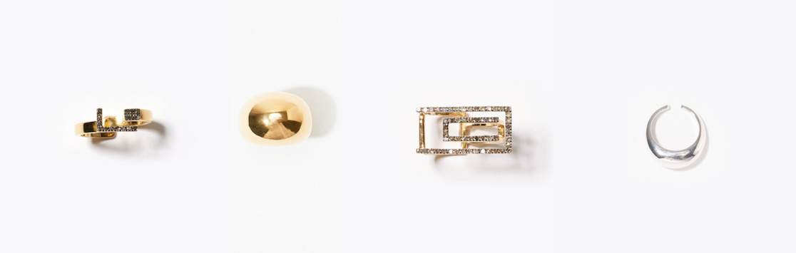 (左から)"meander" pave diamond open ring 17,280yen (with tax) / "bone" bean dome ring 15,120yen (with tax) / "meander" double rectangle pave diamond open ring 32,400yen (with tax) / "bone" bean chunky silver ear cuff 8,640yen (with tax)