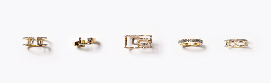 (左から)"meander" rectangle pave diamond open ring 51,840yen (with tax) / "meander" pave diamond open ring 17,280yen (with tax) / "meander" double rectangle pave diamond open ring 32,400yen (with tax) / "lotus" full eternity double pave diamond ring 46,440yen (with tax) / "meander" double pave diamond ring 49,680yen (with tax)