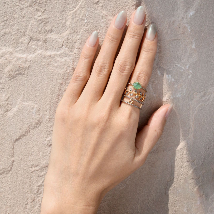 今回は、このシリーズのリング、5つのモデルを使ったスタッキングのスタイリングをご紹介していきたいと思います。シンプルなデザインなので、どんなリングにもレイヤードでき、ボリューミーな煌めきをもたらします。