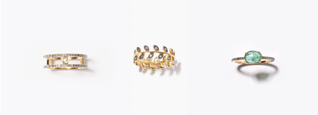 (左から)"meander" double pave diamond ring 49,680yen (with tax) / "citronnier" leaves pave diamonds ring 25,920yen (with tax) / "elafonisi" emerald pave diamond eternity ring 29,160yen (with tax)