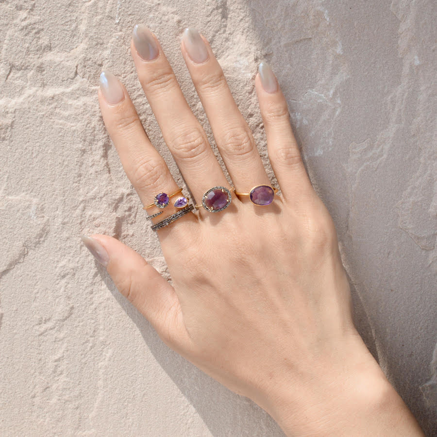 パヴェダイヤモンドのエタニティを2重にしたボリュームのあるリングは、合わせるリングのデザインを選ばない優れもの。アメジストのストーンでまとめた、ARTIDA OUDらしいスタイリングです。