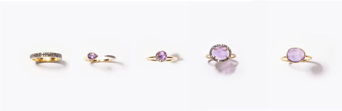 (左から)"lotus" full eternity double pave diamond ring 46,440yen (with tax) / "elafonisi" pear shape dark amethyst pave open ring 18,360yen (with tax) / "elafonisi" dark amethyst new moon pave diamond ring 15,120yen (with tax) / "elafonisi" amethyst pave diamond ring 25,920yen (with tax)