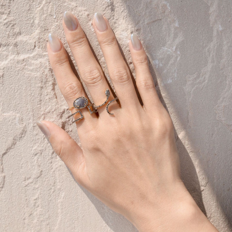 パヴェダイヤモンドのダブルラインのオープンリング。同じブラウンダイヤ×ブラックロジウム素材のヘビモチーフのリングと、ラブラドライトのリングでシックにまとめました。
