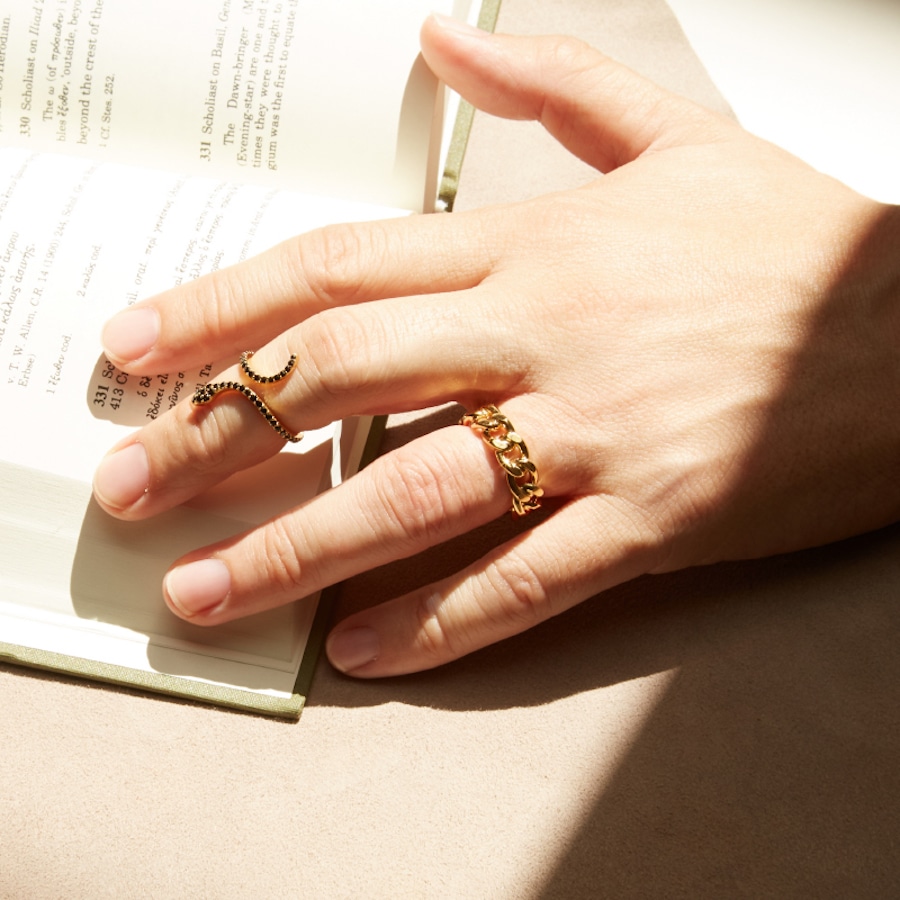 (中指)"viper" unisex spinel ring 46,440yen (with tax) / (薬指)"code" curve chain ring 10,800yen (with tax)
