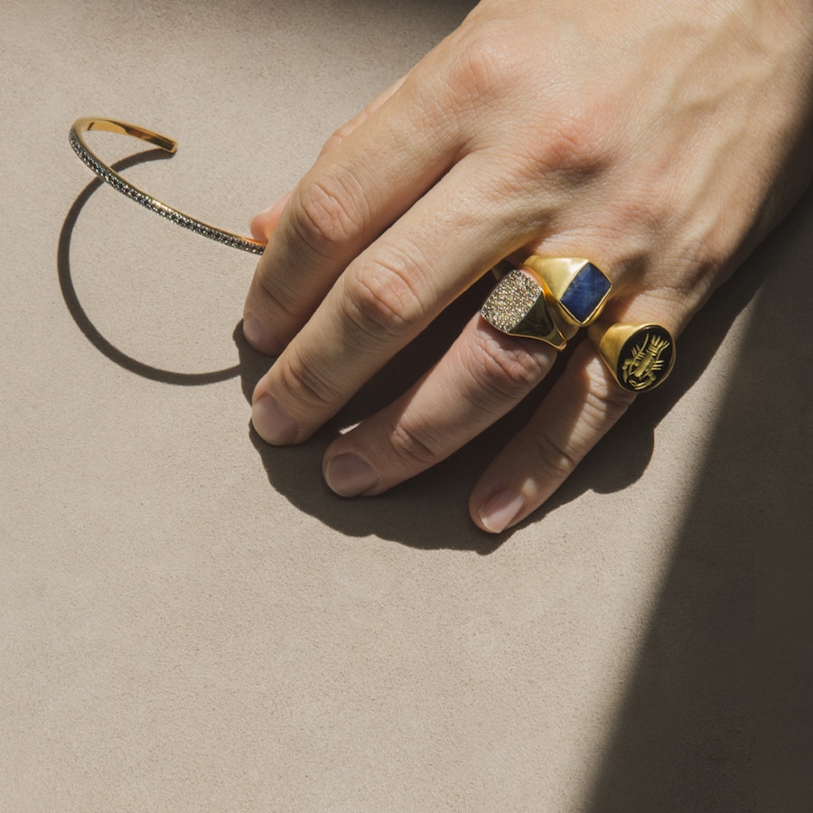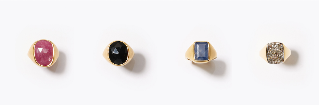 大振りのカラーストーンをあしらったシグネットリング。ルビーとオニキスはオーガニックなシェイプが、ブルーサファイアはモダンなスクエアフォルムがポイントです。ダイヤモンドのパヴェを敷き詰めたリングはとてもゴージャスで華やか。いずれのリングも男性にも女性にもオススメです。