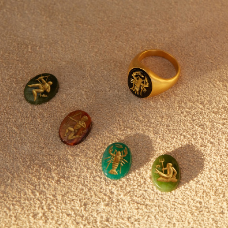 天然石に星座のカーヴィング(彫り)をほどこしたシグネットリングです。こちらはとてもスペシャルな一点もの。イタリア・ナポリの職人から譲り受けたヴィンテージのカーヴィングストーンを、サイトでサイズオーダーいただけます。限定数個しかないのでお見逃しなく!