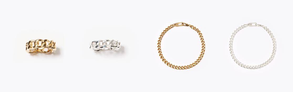 "code" curve chain ring 10,800yen (with tax) / "code" curve chain silver ring 10,800yen (with tax) / "code" curve chain bracelet 12,960yen (with tax) / "cord" curve chain silver bracelet 12,960yen (with tax)