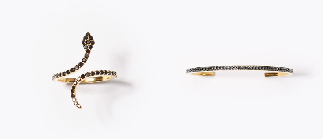 一緒に着けているのは、ブラックスピネルの”viper”リング。同じ素材で、シンプルな”lotus”バングルもオススメです。バングルは少しオリエンタルなムードで、男性にも似合う静かな輝きを取り入れました。こちらの2アイテムのみ、9月下旬以降発売予定となります。